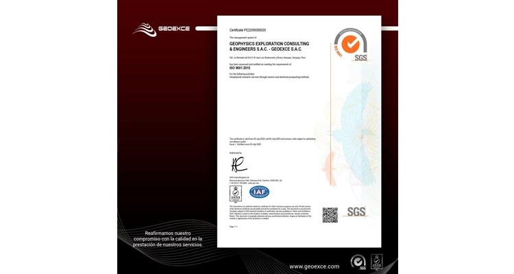 Porque para nosotros la calidad es primordial en nuestros servicios reafirmamos nuestro compromiso obteniendo la certificación ISO 9001:2015 En Geoexce somos especialistas en prospección y exploración del subsuelo